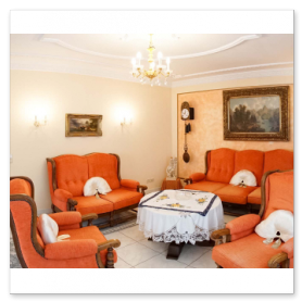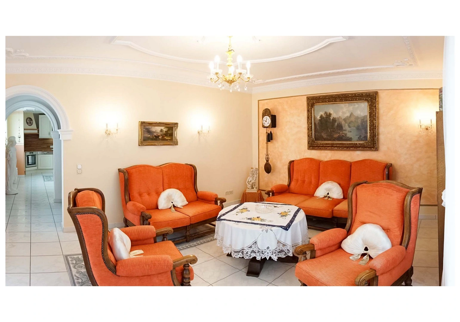 - Living room, flat screen TV, stereo with CD, furniture in the style of King Louis XIII. from France, handcrafted in solid oak. 7-seater sofa set, crystal chandelier, wall clock, various paintings